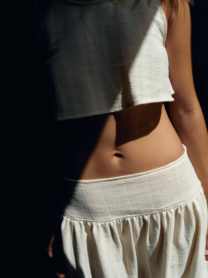 Ana mide 1,76cm; su cintura mide 64cm y está usando The Essencial skirt en talla S.